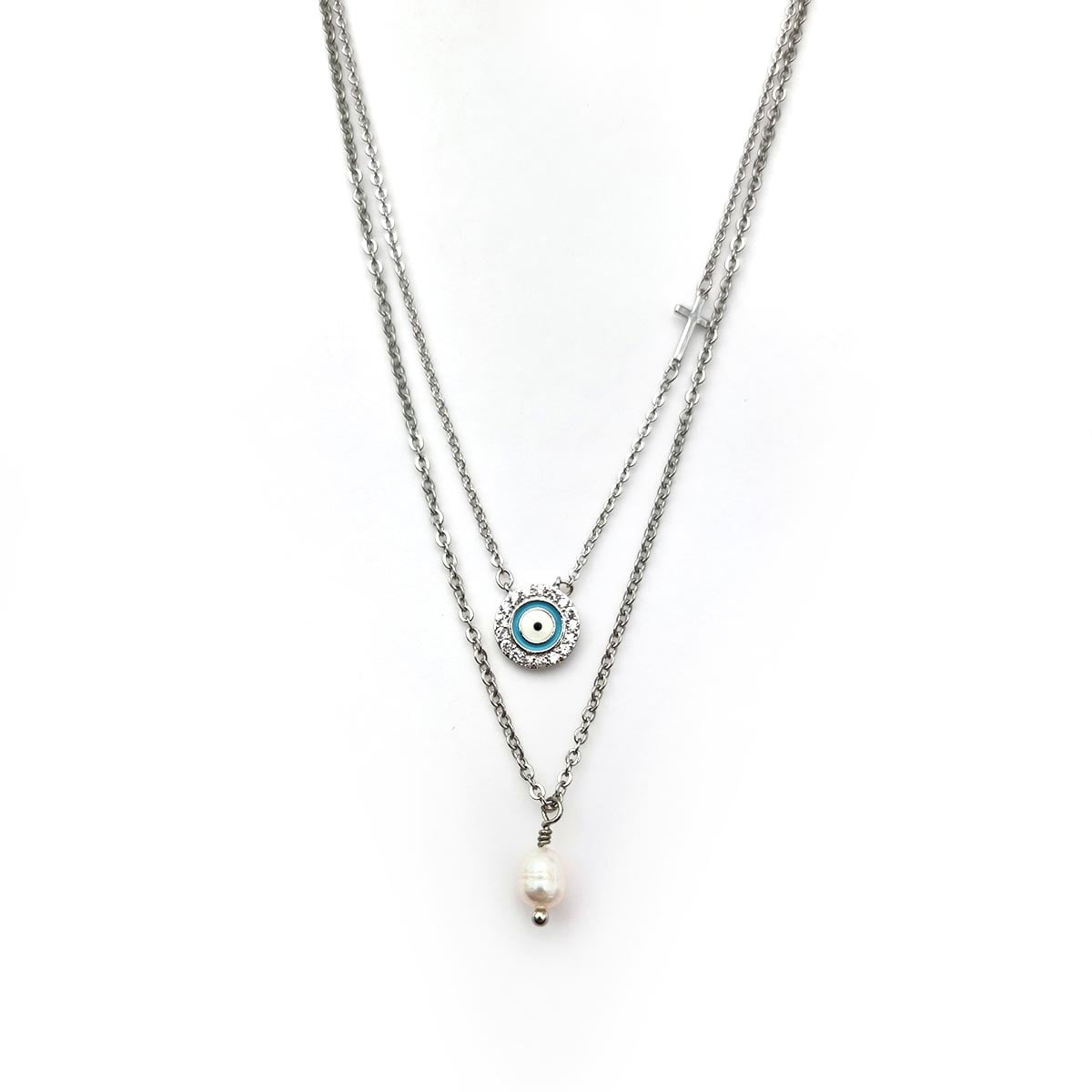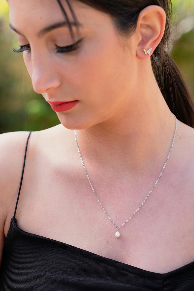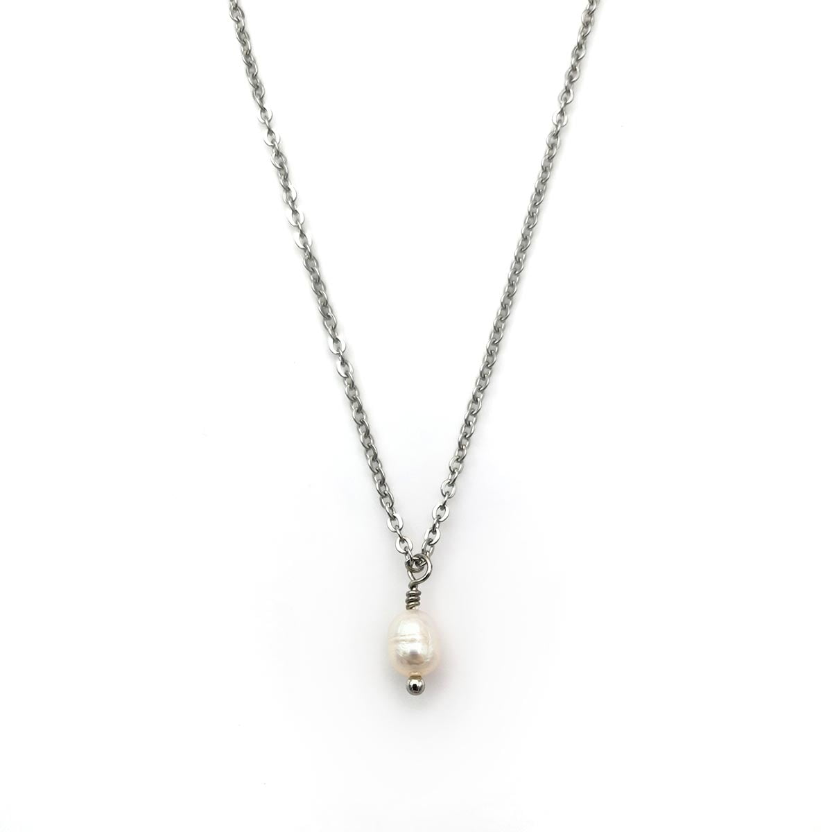 Κλασσικό και διακριτικό κολιέ με μικρό μενταγιόν μαργαριτάρι, από ανθεκτικό και υποαλλεργικό ανοξείδωτο ατσάλι σε ασημί χρώμα. Με κούμπωμα καβουράκι, χωρίς προέκταση. Φόρεσε το όλες τις ώρες της ημέρας. Είναι ιδανικό για να το φορέσεις μόνο του ή για να κάνεις layering με άλλα κολιέ της συλλογής μας.