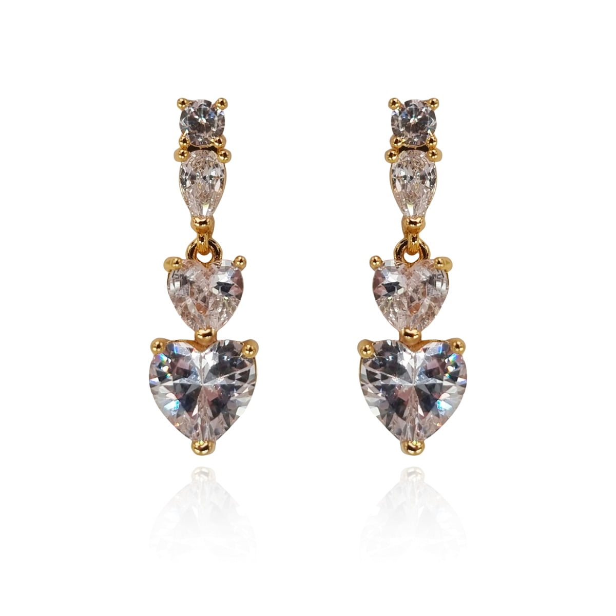 Σκουλαρίκια Chiara σε κρεμαστό σχέδιο φτιαγμένα από ανοξείδωτο, υποαλλεργικό ατσάλι σε χρυσό χρώμα και μεγάλα, λαμπερά ζιργκόν καρδιές. Ιδανικά τόσο για καθημερινές εμφανίσεις όσο και για εξόδους. Είναι ευκολοφόρετα και συνδυάζονται εύκολα με πολλά διαφορετικά στυλ. Προσθέτουν μία πινελιά λάμψης χωρίς να είναι υπερβολικά. Ιδανικό δώρο για αγαπημένα πρόσωπα.