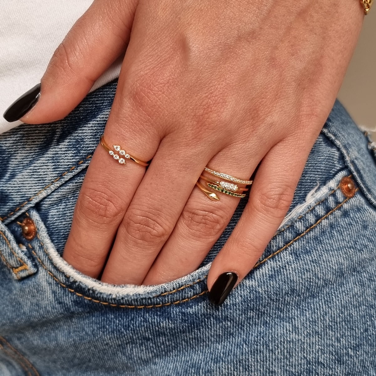 Δαχτυλίδι σε σχέδιο που αγκαλιάζει το δάχτυλο και προσαρμόζεται στο μέγεθος που επιθυμείς. Από ορείχαλκο σε χρυσό χρώμα με λαμπερά ζιργκόν σε λευκό χρώμα. Είναι μοντέρνο, διακριτικό αλλά και λαμπερό, κατάλληλο τόσο για καθημερινές εμφανίσεις όσο και για βραδινές εξόδους και κοινωνικές εκδηλώσεις.