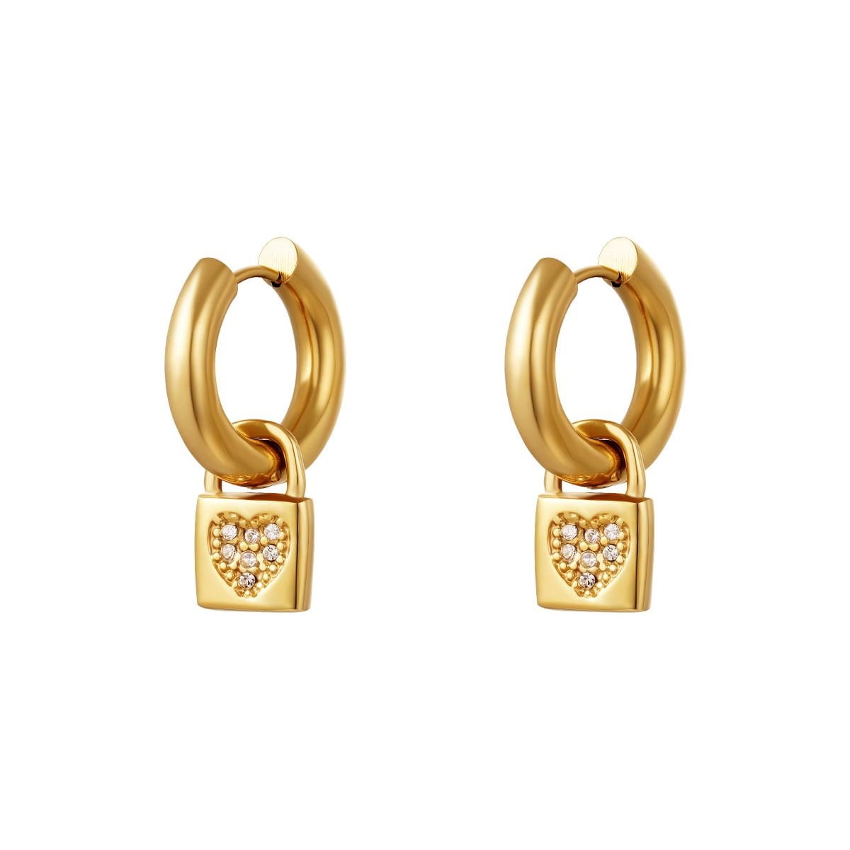 Σκουλαρίκια κρίκοι με κρεμαστό λουκέτο με καρδιά από κρύσταλλα. Από ανθεκτικό και υποαλλεργικό ανοξείδωτο ατσάλι σε χρυσό χρώμα. Είναι μοντέρνα και συνδυάζονται εύκολα με πολλά διαφορετικά στυλ. Προσθέτουν μία πινελιά λάμψης χωρίς να είναι υπερβολικά ή ογκώδη. Φόρεσε τα μόνα τους ή συνδύασε τα με άλλα σκουλαρίκια της συλλογής μας.
