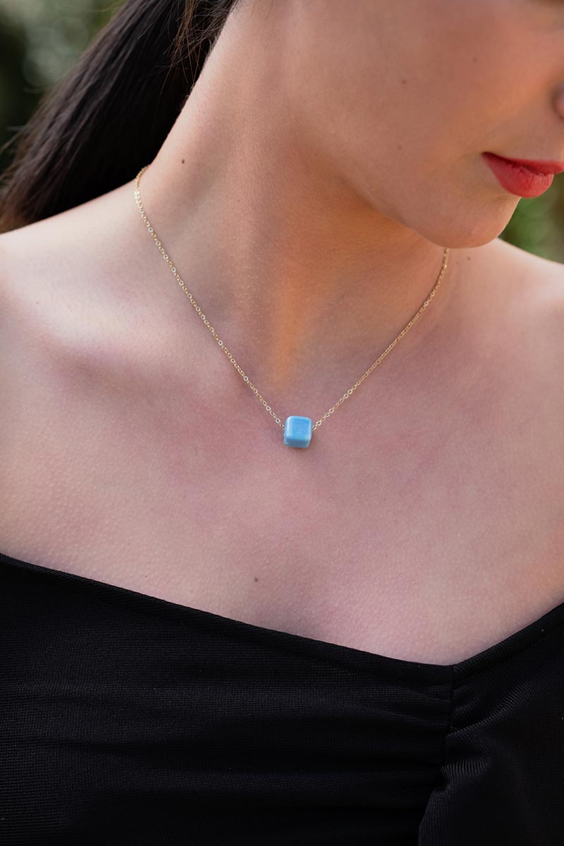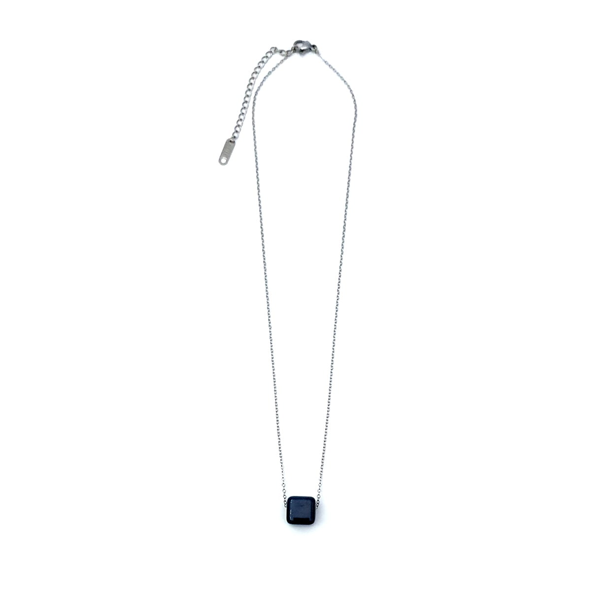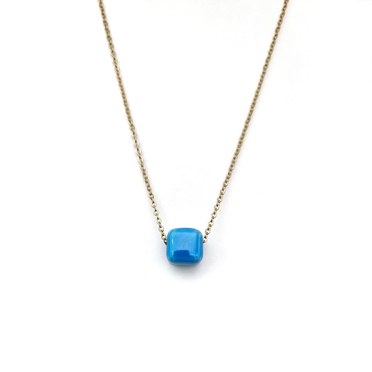 Κλασσικό και διακριτικό κολιέ με λεπτή αλυσίδα cable και μενταγιόν τετράγωνη κεραμική χάντρα σε μαύρο ή τιρκουάζ χρώμα με επικάλυψη σμάλτου. Η αλυσίδα είναι από ανθεκτικό και υποαλλεργικό ανοξείδωτο ατσάλι σε ασημί ή χρυσό χρώμα. Με κούμπωμα καβουράκι και προέκταση για προσαρμογή μήκους. Φόρεσε το όλες τις ώρες της ημέρας.