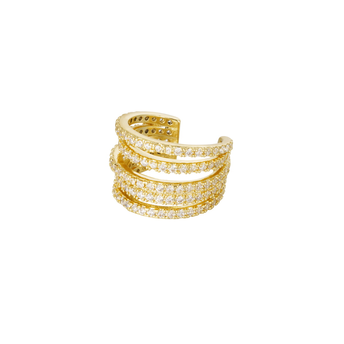 Εντυπωσιακό σκουλαρίκι ear cuff Paulina διακοσμημένο με 5 σειρές από λαμπερά ζιργκόν. Από επιχρυσωμένο ορείχαλκο 18Κ και ζιργκόν κρύσταλλα σε λευκό χρώμα. Μοντέρνο σχέδιο, ιδανικό για εντυπωσιακές βραδινές εμφανίσεις. Το συγκεκριμένο σκουλαρίκι φοριέται μεμονωμένο, όχι ως ζευγάρι και συνδυάζεται εύκολα με πολλά διαφορετικά στυλ, προσθέτοντας μία επιπλέον πινελιά λάμψης στην εμφάνισή σου. Συνδύασε το με άλλα σκουλαρίκια της συλλογής μας για ένα ολοκληρωμένο βραδινό ear stack, φτιάχνοντας έτσι εντυπωσιακούς συνδυασμούς και ολοκληρωμένο styling στα σκουλαρίκια σου. Κατασκευασμένο από ανθεκτικό και υποαλλεργικό ορείχαλκο επιχρυσωμένο με στρώση χρυσού 18Κ, με σύσταση χωρίς νικέλιο για να μην προκαλεί αλλεργίες και ερεθισμούς. Δεν θολώνει, δεν μαυρίζει και δεν ξεβάφει στο δέρμα κατά την συνηθισμένη χρήση.
