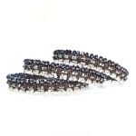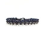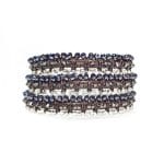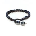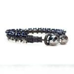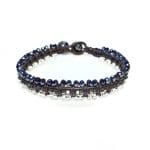 Χειροποίητο, πλεκτό βραχιόλι με δερμάτινο κορδόνι, μία σειρά με κρύσταλλα σε μαύρο χρώμα, μία σειρά με γυάλινες χάντρες σε λευκό / ασημί και μία σειρά με χάντρες αιματίτη σε σκούρο μεταλλικό χρώμα. Διπλό κούμπωμα με μεγάλες κρυστάλλινες χάντρες και θηλιά για να ταιριάζει στους περισσότερους καρπούς. Σχεδιάζεται και φτιάχνεται εξ΄ολοκλήρου στο χέρι στην Ελλάδα.