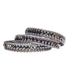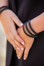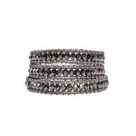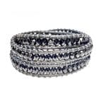 Χειροποίητο, πλεκτό wrap βραχιόλι που τυλίγεται 3 φορές γύρω από τον καρπό. Φτιαγμένο με δερμάτινο κορδόνι και τρεις σειρές με κρύσταλλα σε μαύρο χρώμα. Διπλό κούμπωμα με μεγάλες κρυστάλλινες χάντρες και θηλιά για να ταιριάζει στους περισσότερους καρπούς. Σχεδιάζεται και φτιάχνεται εξ΄ολοκλήρου στο χέρι στην Ελλάδα.